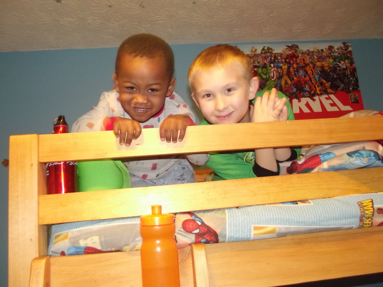 Eventually, we just started letting him sleep with Chase, as I am a big believer in whatever works for everyone to get a good night's sleep. They both seemed happy as clams with the arrangement so we decided to invest in a set of bunk beds. Finally we were able to pick them up in early December, and to say the boys were excited is a total understatement. Even now, more than a month later they switch from top to bottom bunk until they finally settle down in one. Nevermind, the fact we chose a twin over full model thinking they would at least sleep downstairs if they chose to sleep together, they are always two peas in a pod.